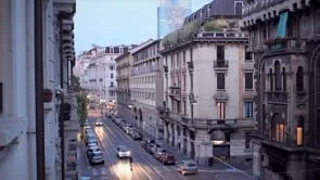 L’angolo di un edificio tra via Cola Montano e piazza Fidia a Milano. Il muro è di pietra grigia.
